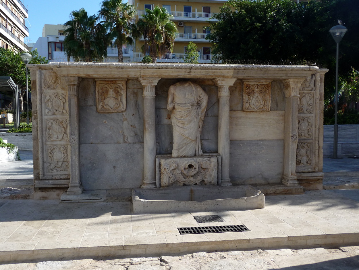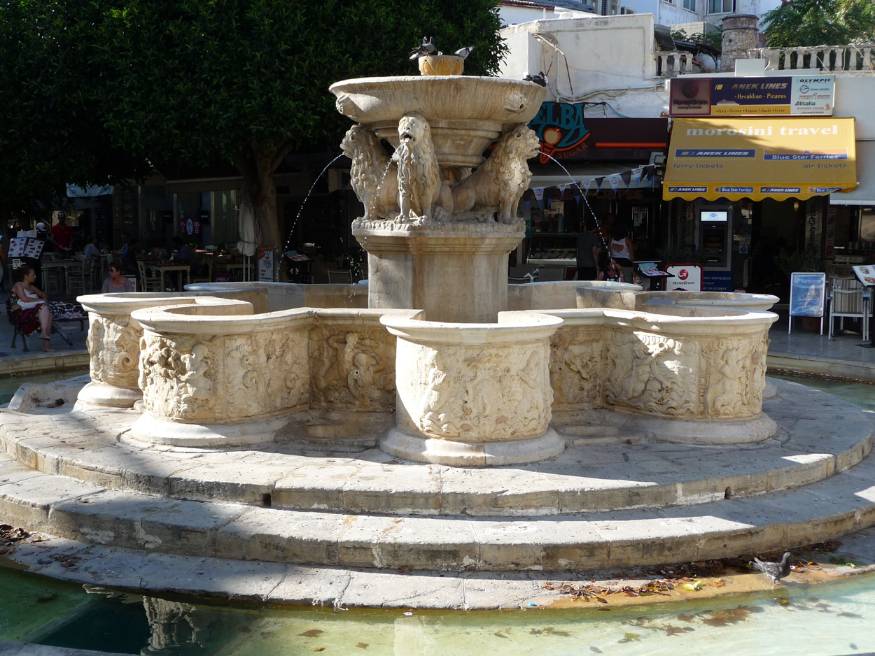 Séjour à l'hôtel Kronos, qui est très bien situé et très confortable; il est moins cher que le Lato et n'a pas grand chose à lui envier. Très bon accueil et le réceptionniste est très aimable. Beaucoup de monde à Héraklion et en particulier autour de la fontaine Morosini (photo de gauche) qui est le point central de l'animation en journée. La réfection de la place de la fontaine Bembo (photo de droite) et de la fontaine turque est maintenant terminée; jolie place avec un beau revêtement au sol tout neuf mais personnellement je préférais l'ancienne version avec des terrasses de cafés remplies et une animation bien sympathique; maintenant c'est très froid.