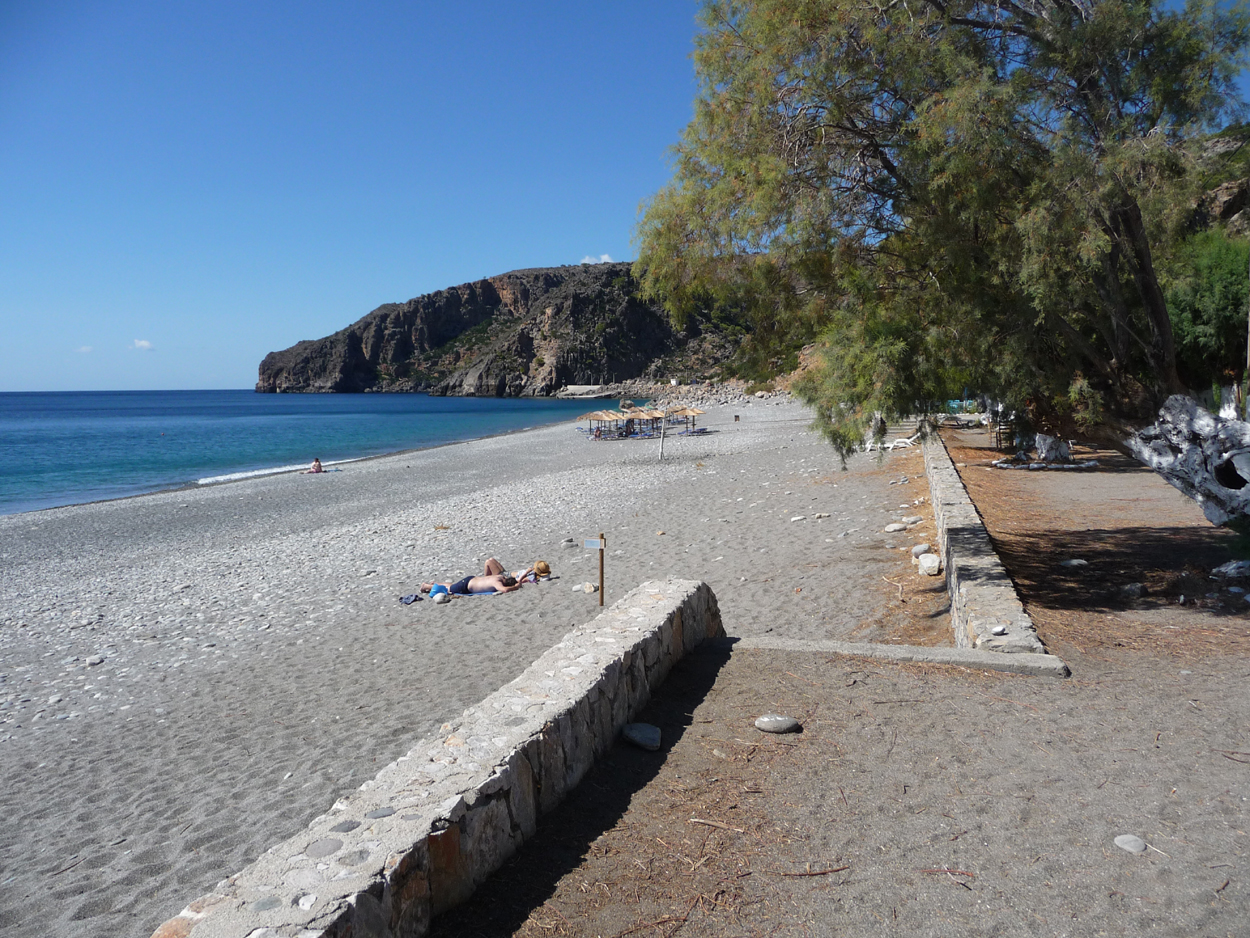 De Paleochora à Sougia peu de kms mais il faut compter 45 minutes, la route est sinueuse. Excellent accueil du patron de l'hôtel Syia, très bavard et désireux de nous aider (en grec ou anglais). Curieusement fin septembre tous les hôtels sont remplis, c'est la saison des marcheurs qui vont soit dans les gorges d'Agia Irini soit dans celles plus connues de Samaria. Sougia c'est le pont final de la route, une jolie plage et une petite station qui s'agrandit tout doucement, un distributeur d'argent est maintenant installé près de l'hôtel Syia. Beaucoup moins de monde qu'à Elafonissi heureusement mais la mer nous parait beaucoup plus froide. Des restaurants et cafés agréables (jus d'orange à 2 euros). J'espère qu'au mois d'Août la petite station n'est pas trop envahie.