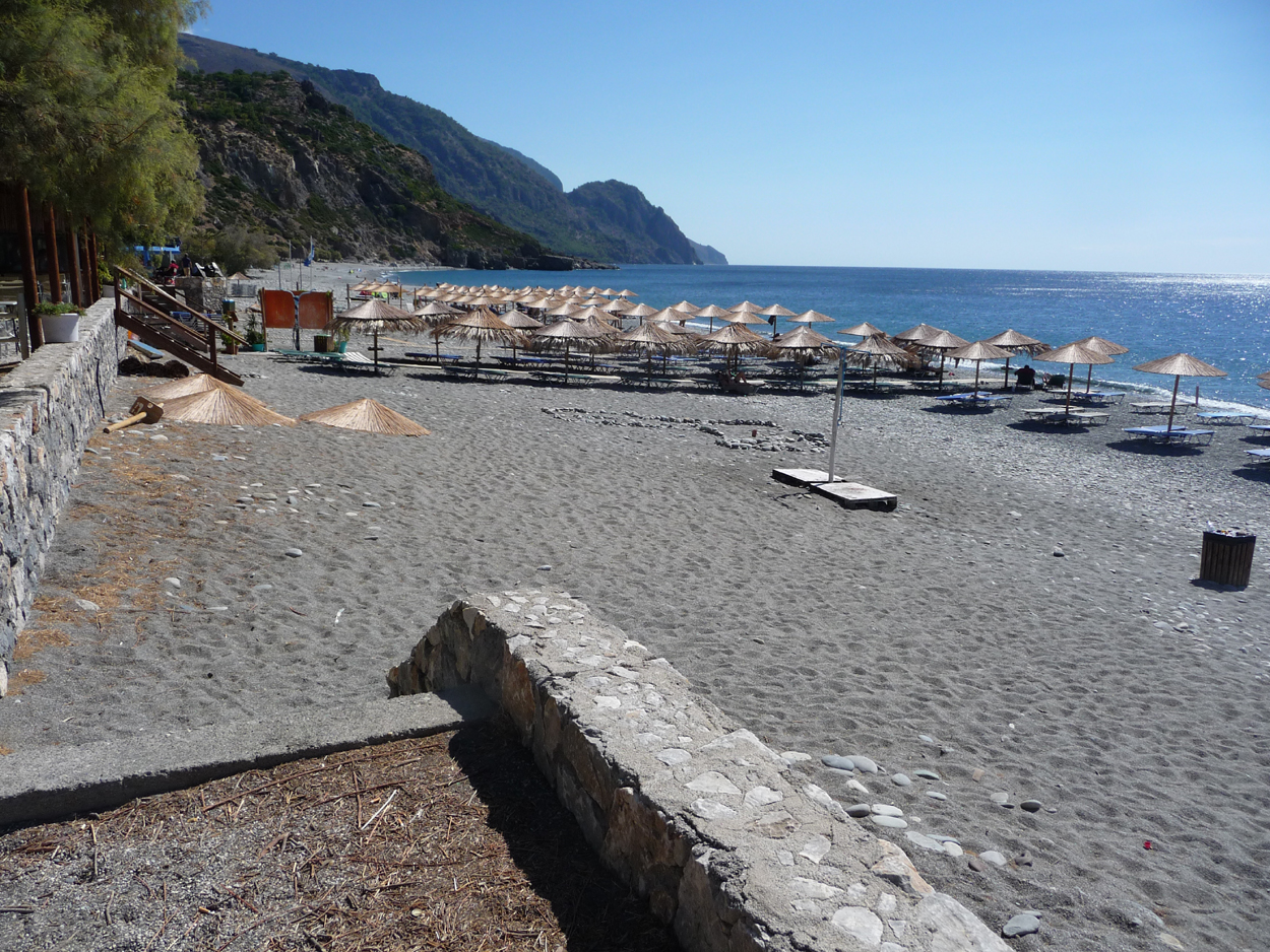 Pour aller à Paleochora on doit remonter vers le nord, pas de route suivant la côte. Nous logerons encore à l'hôtel Aris, avec un excellent accueil et un très bon petit déjeuner (avec vrai jus d'orange pressé ce qui est rare). Le 21 septembre à Paleochora vent de force 5 donc impossible de se baigner sur la plage de sable, nous n'avions pas encore vu de telles vagues sur cette plage, elles atteignaient les rangées de chaises longues. Un bar sur la plage de sable, le Veggera où le jus d'orange n'est qu'à 2 euros.