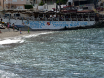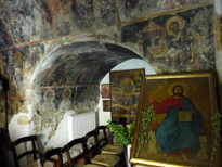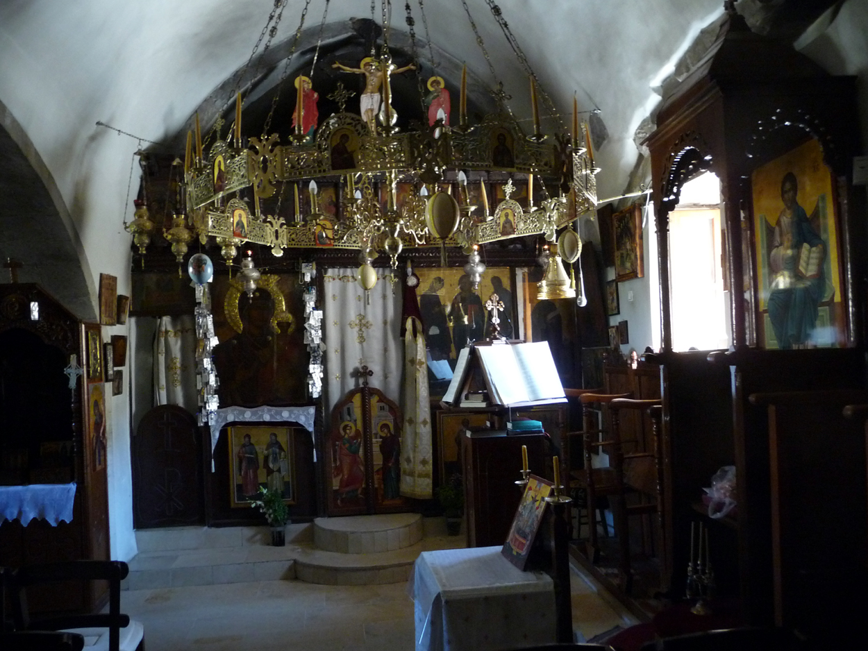 Pour ce qui est du monastère, finalement pas grand chose à voir, je vous conseille d'aller plutôt voir celui d' Odiyitria près de Sivas. En effet ils ont aménagé un petit musée intéressant, on peut voir l'ancienne cellule d'un moine, le moulin à huile (huile de ???, un loukoum à qui trouvera), la presse à raisin, de vieux outils et on peut grimper dans une tour elle aussi aménagée. De plus la vue panoramique sur la mer et les oliviers est superbe et on a aménagé un grand parking, la route asphaltée s'arrête là. Dans la boutique un moine offre loukoum et gâteau et vous pourrez acheter du rakomello, ou si vous préférez une crème miraculeuse (forcément elle est faite par les moines) qui est bonne à peu près contre toutes les affections de la peau.