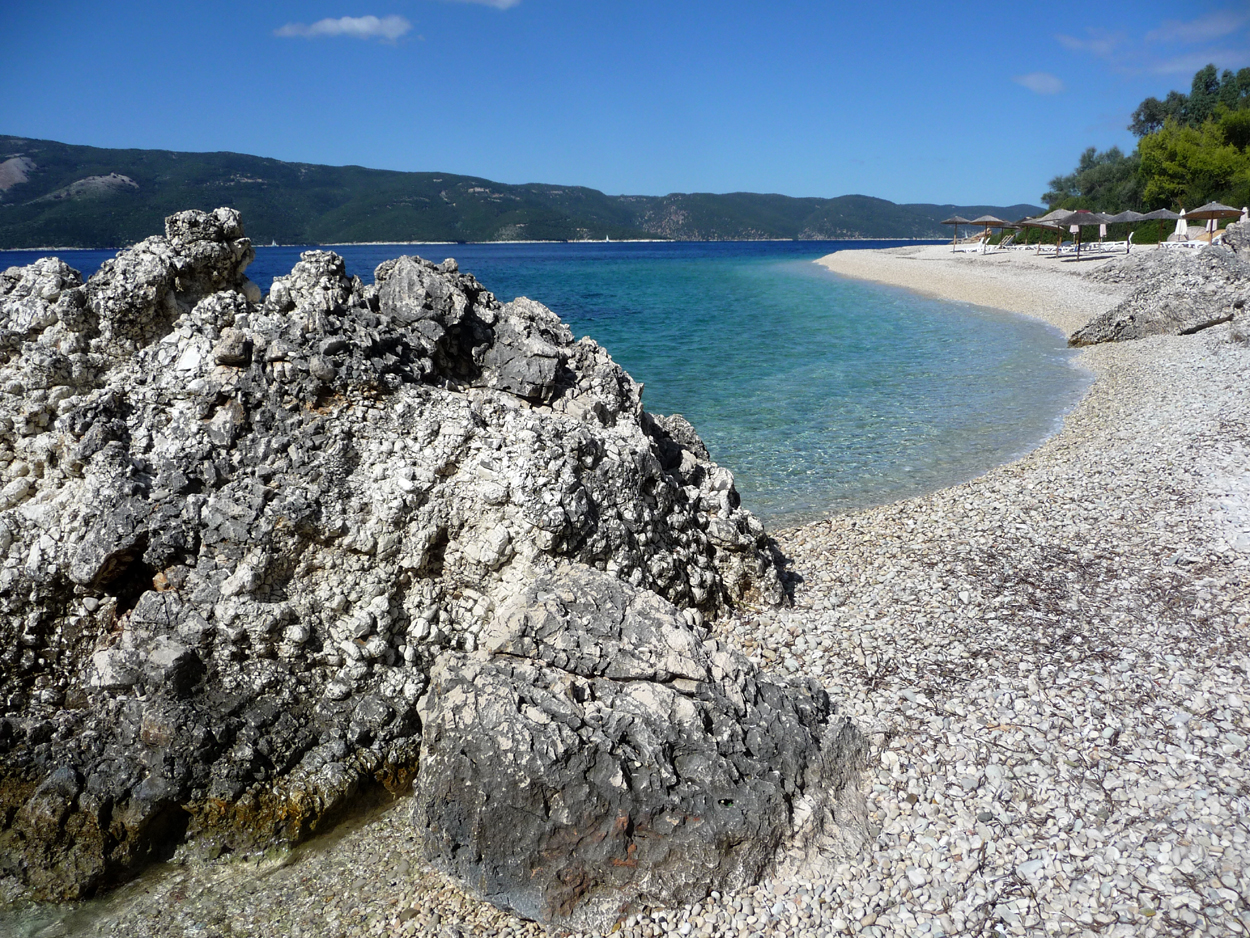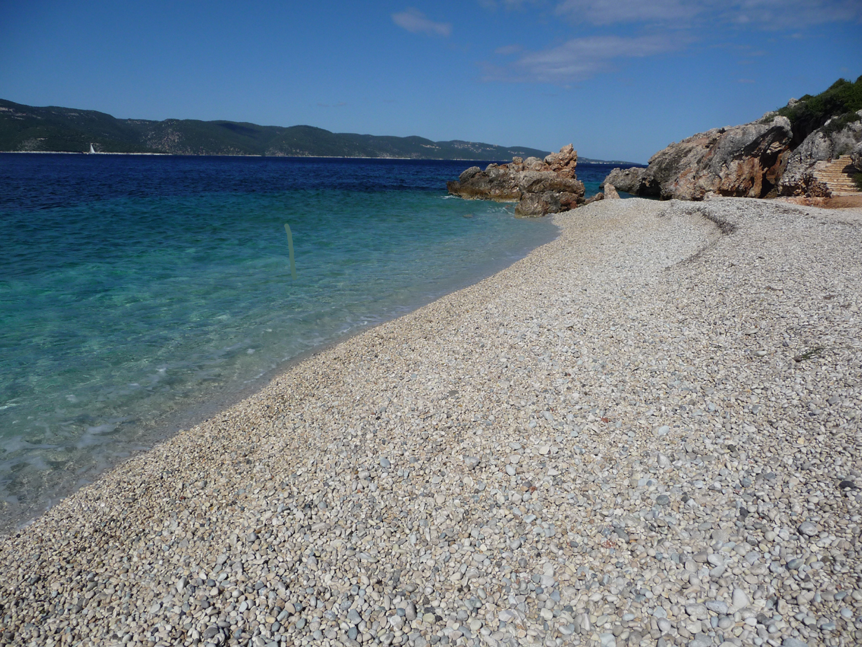 L'autre route à l'ouest donne une vue sensationnelle sur Céphalonie. Elle passe par la plage d'Agios Ioannis (appelée Aspro Gialos sur les panneaux). Pour y aller prendre une petite route à l'entrée de Lefki. Cette plage de galets est pour nous la plus belle de l'île.