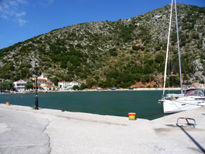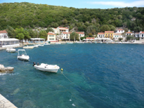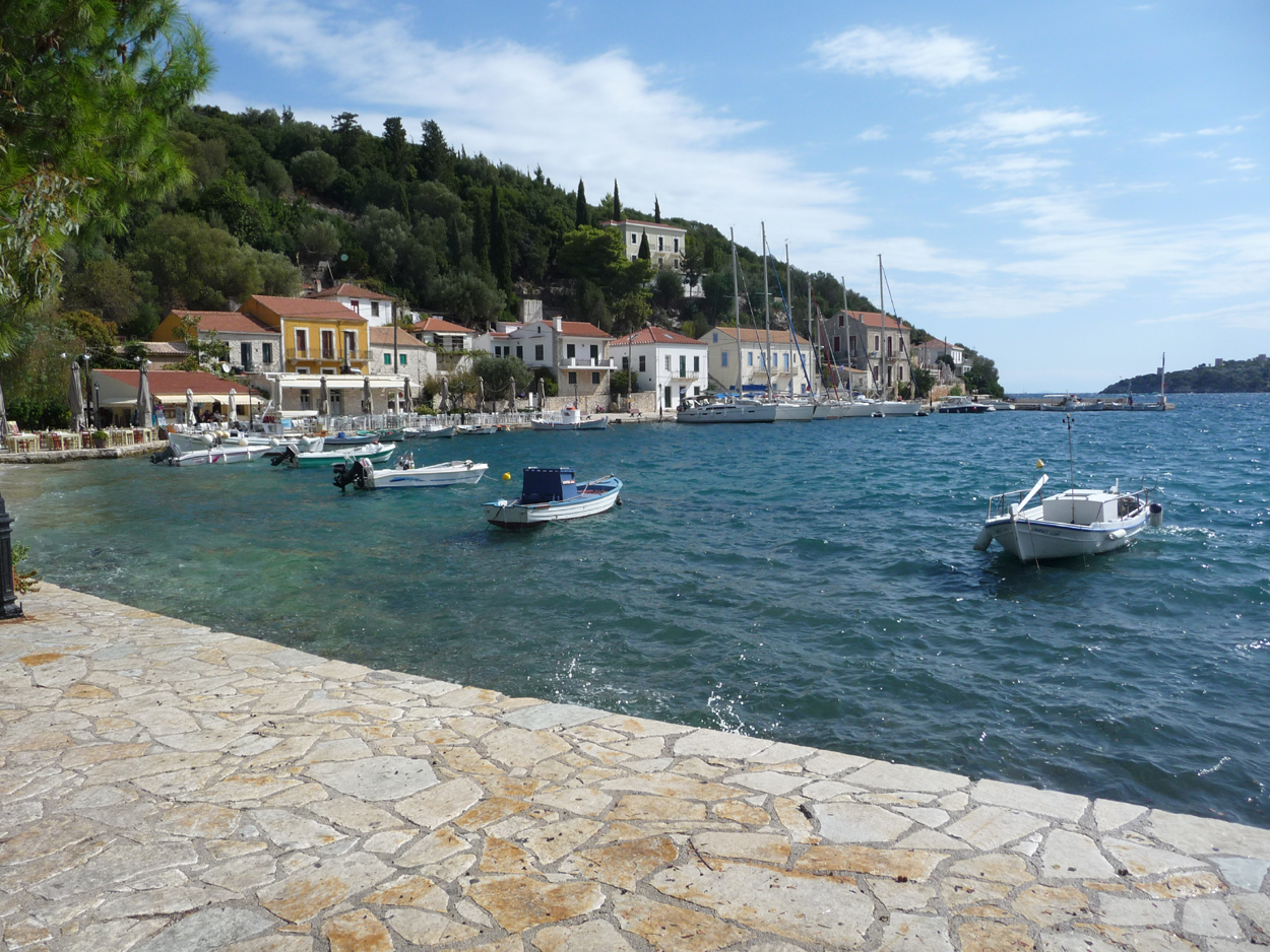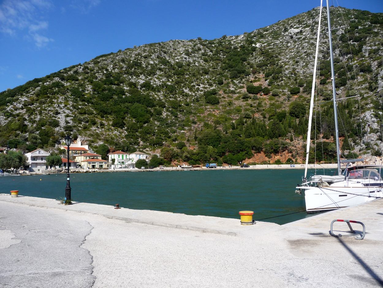 A l'est de Frikes de jolies petites criques pour se baigner et plus loin Kioni qui est pour nous le plus beau village de l'île. Il faut descendre depuis le premier panneau Kioni en haut de la colline, puis se garer sur le parking à l'entrée du port. Ballade ensuite le long du port, qui doit être très animé en été, à en juger par le nombre de cafés/restaurants. Ce jour là nous mangerons à l'abri de bâches car le vent souffle très fort.