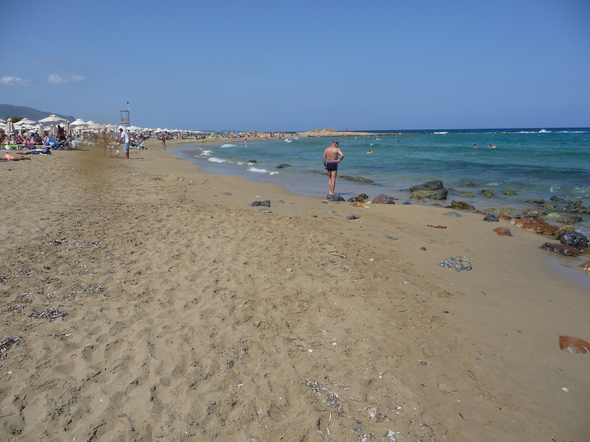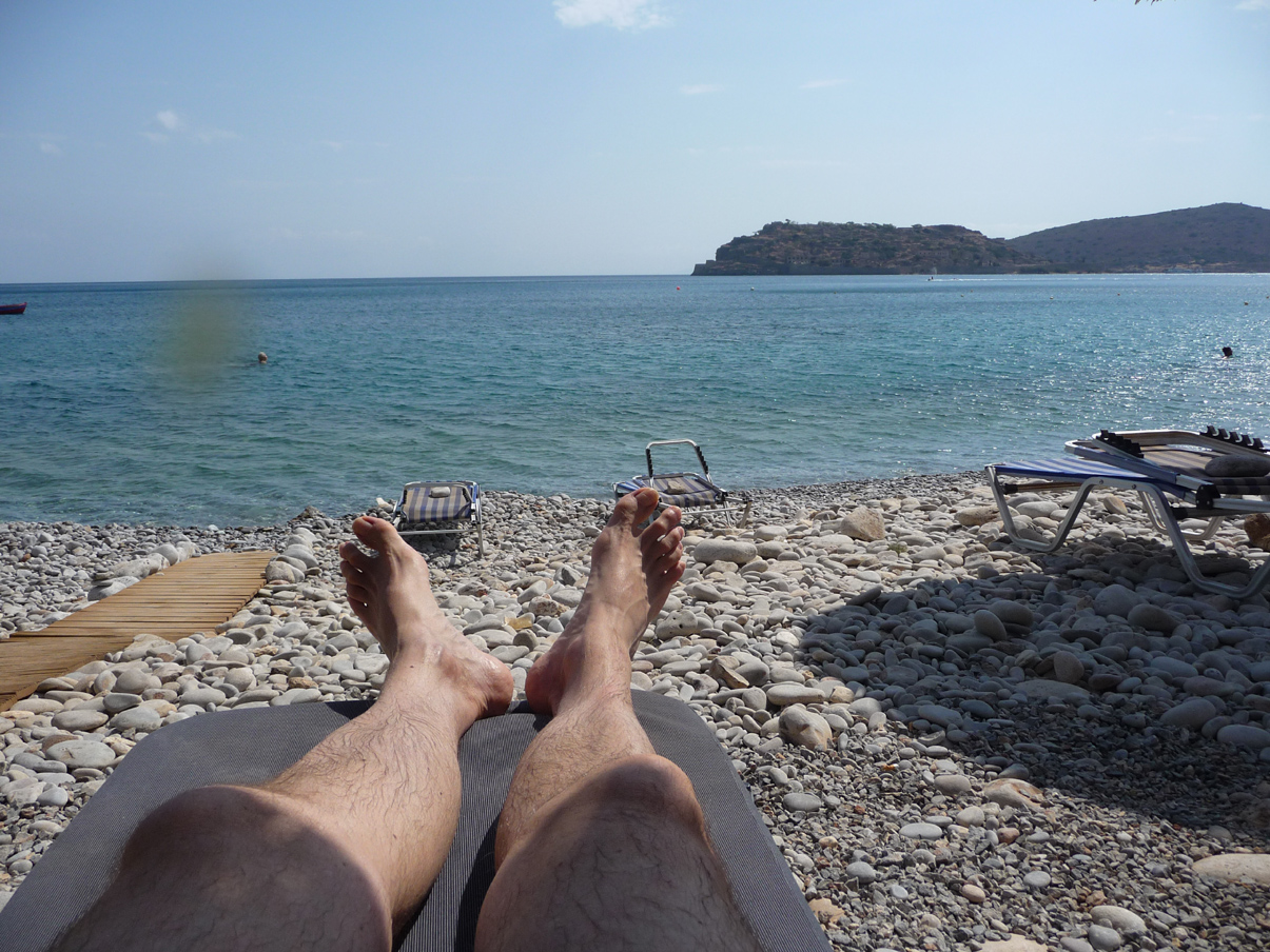 Le lendemain après le petit déj pris sur la terrasse comme il fait toujours très beau direction ... la mer. On passe par Elounda (toujours du monde et pas agréable) pour aller jusqu'à Plaka où nous irons nous baigner sur la plage de galets. Coût de deux transats et d'un parasol: 7 euros. Une eau très transparente et peu agitée mais les gros galets font vraiment très mal aux pieds, sont glissants et je recommande des chaussures pour ceux qui envisagent un séjour ici.