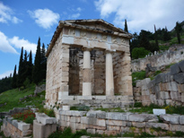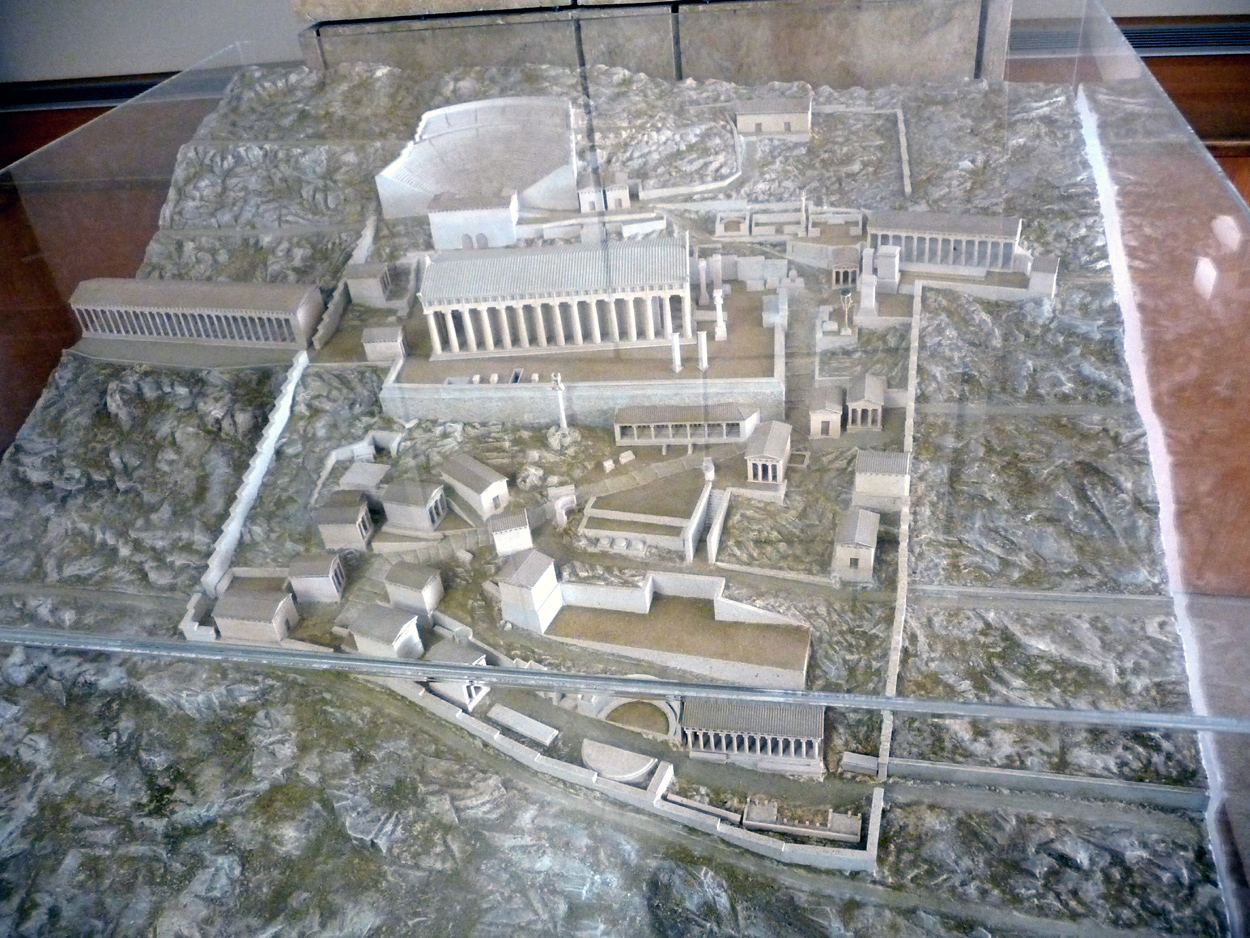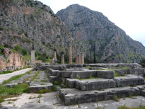 On entre dans le sanctuaire d'Apollon par la voie sacrée (en bas à droite sur la photo de la maquette, qui se trouve dans le musée) et on arrive au fameux trésor des Athéniens. On parvient ensuite aux ruines du grand temple d'Apollon, puis au théatre.