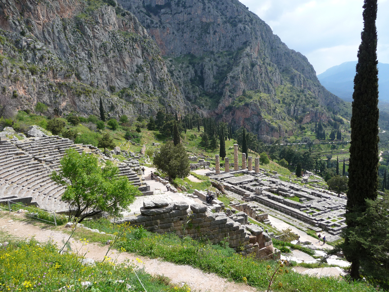 Avantage à Delphes pour ceux qui ne pratiquent pas l'anglais ou le grec, les commentaires sont aussi en français. Le grand charme du site est la situation qu'il occupe, même si aujourd'hui la vue est un peu obscurcie par le temps gris qui règne.