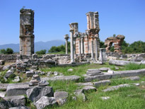 Nous avons trouvé assez d'énergie pour aller visiter le site de Philippi. Pour y aller ce n'est pas loin mais attention les panneaux nous dirigent vers le grand théatre, qui est le siège de manifestations en été comme à Epidaure ; le site et le musée sont un peu plus loin et leur accès est très dangereux. Un tout petit parking le long de la route très passante et c'est en circulant le long de la route qu'on va acheter son ticket ; le site est lui même séparé en deux parties par cette route (un feu permet théoriquement d'arrêter le trafic pour traverser de l'un à l'autre mais méfiez vous). Le musée est un peu plus loin encore mais il était femé lors de notre venue pour rénovation.