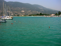 Côté Est : en descendant de Leucade pas mal de petites plages mais il y a du monde en particulier à Nydri. Nous nous y sommes arrêtés dans un bar en face du port mais la rue principale est une succession de boutiques. Le port est assez joli avec la vue sur les ilôts voisins mais dans le genre Vassiliki est à mon avis beaucoup plus intéressant. On a vu la façon dont quelques anglais passent leur vacances à Nydri ; bronzette sur des transats en face du port là où l'eau n'est certes pas la plus claire ; il y a de bien meilleurs endroits sur l'île : Mais qu'ils restent là et laissent les endroits plus agréables aux autres.