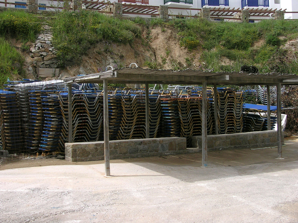 si vous voulez avoir une idée de la fréquentation des plages en été regardez ci-dessous les sièges bien rangés à Platis Gialos attendant la foule.