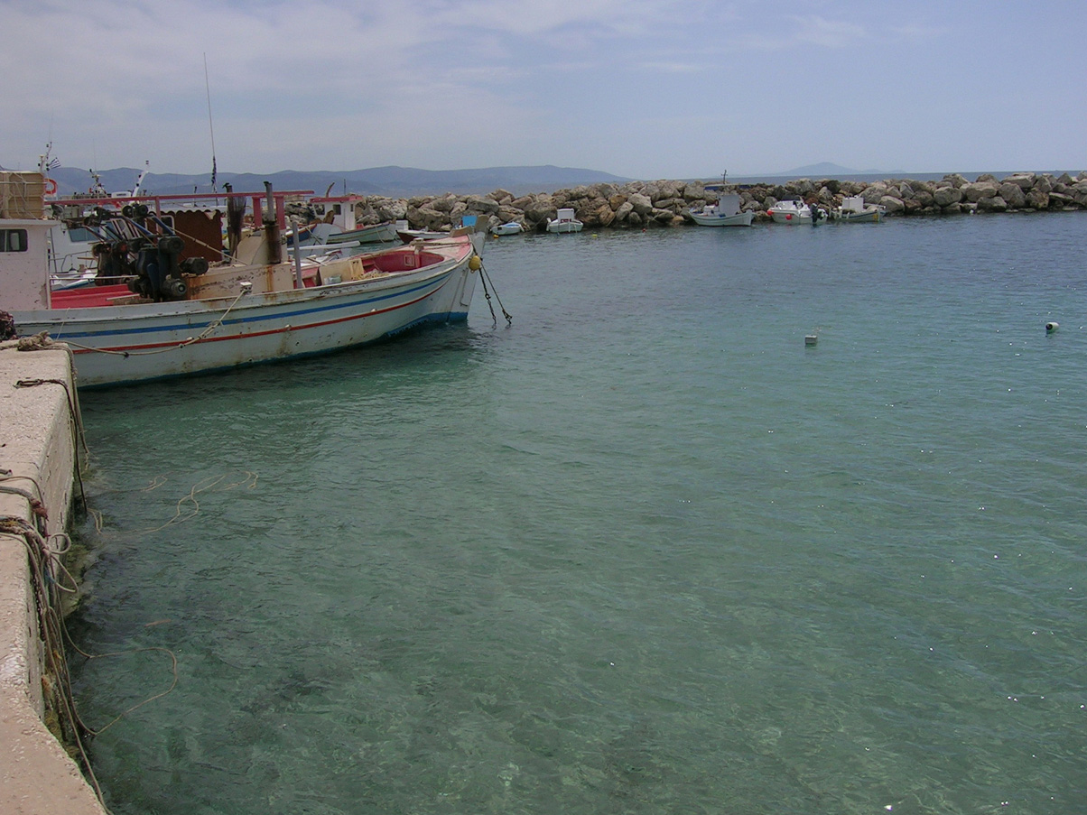 Près de Naoussa un tout petit port désert en avril : Ambelas. En descendant vers le sud on passe ensuite par Marpissa, village qui vaut la peine qu'on s'y arrête. Vous y verrez les papis occupés à ne rien faire, des ruelles très étroites, des églises toutes blanches et même une taverne très décorée