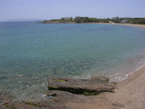 Juste au nord la plage qui est ma préférée dans l'île : Molos. Attention pas facile de la trouver elle est très mal indiquée, les panneaux Molos sont dans le centre inverse de la circulation. Le plus simple est de venir de Marpissa, de tourner pour aller dans le centre (kentro) de Marpissa (petite rue) , puis de surveiller le panneau vers la droite indiquant Molos. Et là une jolie baie abritée, avec du sable fin et dont le fond descend lentement (bien pour les petiots). Quel plaisir de s'y tremper (pas plus haut que les genoux en avril). Pour l'instant c'est très peu construit, dépéchez vous d'y aller.