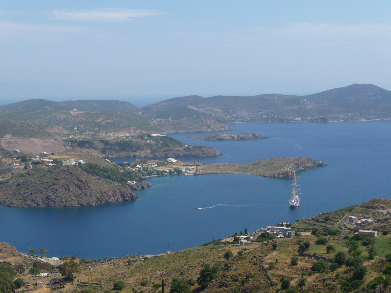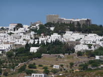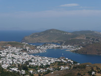 La plus belle étape du voyage. Grâce à la majesté de Chora et du monastère, à la vue magnifique depuis Chora sur le nord de l'île, à ses petites plages du nord et aux discussions que nous avons eues avec notre hôtelier et un ancien ambassadeur rencontré par hasard. La plupart des touristes vont à Patmos d'abord pour voir Chora, le monastère de St Jean et la grotte de l'apocalypse et nous ne faisons pas exception. Nous avons d'ailleurs croisé à plusieurs reprises (l'île est petite) un groupe de francophones dont un moine qui visitaient ces sites; ce groupe était mené par une française très exhubérante installée dans l'île et qui fait le guide. Nous avons logé à Skala à l'hôtel Villa Zacharo dont le proprio est un homme qui adore discuter avec ses clients (en anglais qu'il parle très bien) pour leur raconter plein de choses sur l'île (je vous en dirai quelques unes plus loin); à 35 euros la nuit avec deux bons petits déjeuners, au bord de la route qui mène à Chora, il ne faut pas hésiter à y aller. Nous avions retenu par l'intermédiaire de Zacharo une voiture chez AVIS (en bon état) pour 25 euros par jour; le bureau est sur le port de Skala. Ci-dessous la vue depuis la chambre