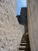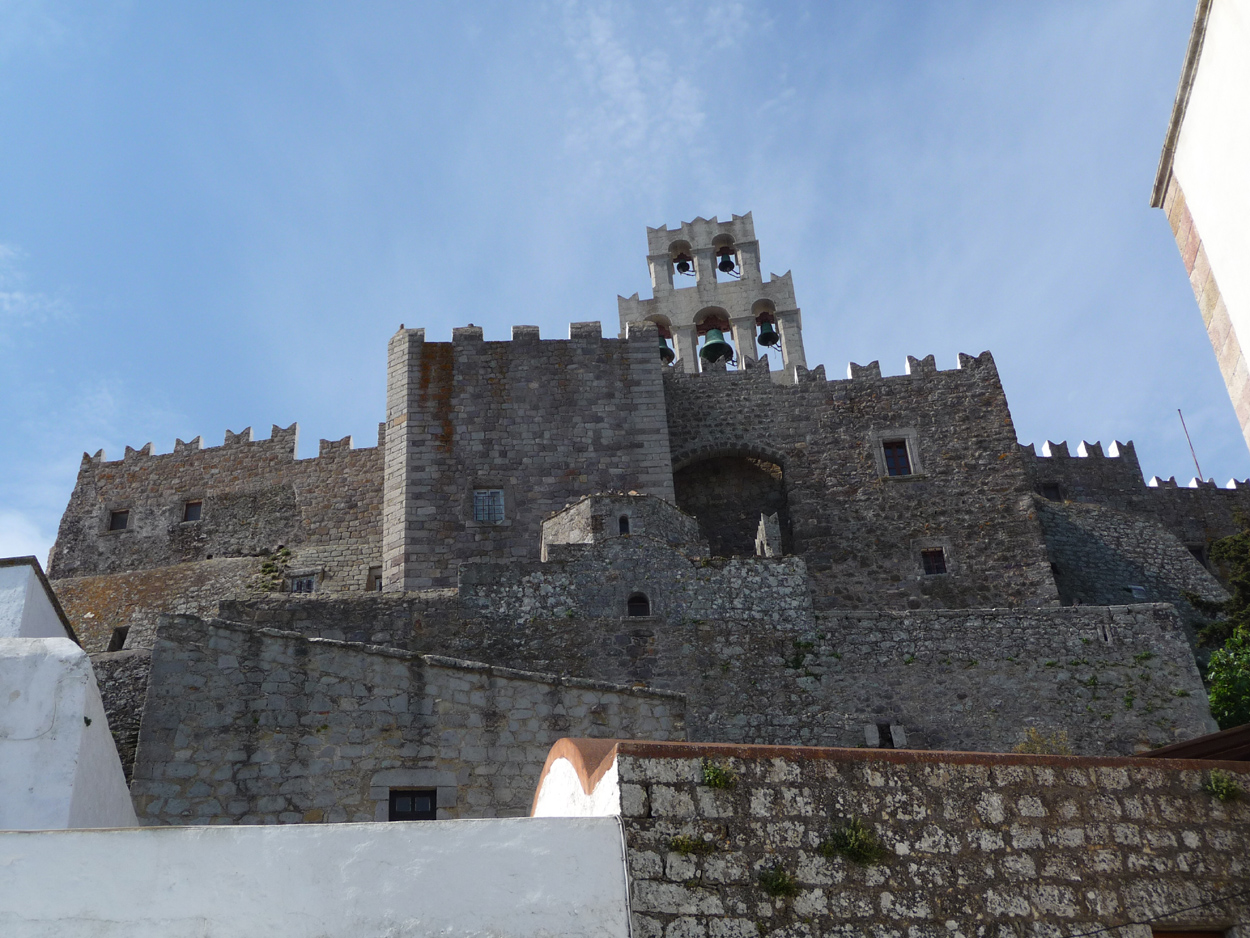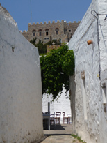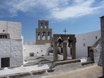 Quand on va de Skala à Chora en voiture on prend une petite route qui mène tout d'abord à la grotte de l'apocalypse. L'entrée est maintenant payante (2 euros) et quand il n'y a pas foule (comme ce jour) on peut méditer dans ce lieu qui servit de retraite à St Jean; une petite chapelle y a été installée. En continuant à monter on arrive à Chora (prendre à droite pour se garer, s'il y a de la place) . La visite du monastère (payante : 4 euros) est intéressante même si on ne peut visiter toutes les salles; le musée en particulier contient des documents très anciens. On peut esuite aller au hasard dans les ruelles de Chora. C'est ce que nous avons fait et nous nous sommes retrouvés par exemple juste sous le mur du monastère; on peut marcher un peu le long de ce mur mais pas en faire le tour. Des maisons blanchies à la chaux, des églises et quelques bars et restos dont certains offrent une vue magnifique sur Skala et le nord de l'île. Nous avons visité la "Nikolaidis mansion" vieille demeure bien restaurée; l'entrée est maintenant payante et franchement on peut se passer de la visite. Nous n'avons pas pu visiter le monastère de Zoodochos pigis, très bien indiqué par de nombreuses pancartes. A notre arrivée devant la porte celle-ci est fermée (aux heures théoriques d'ouverture indiquées sur le mur). Comme nous repartons dans la rue à droite nous demandons à une dame sur le pas de sa porte si le monastère est ouvert, elle nous répond oui, il faut sonner ou frapper. Nous repartons sur nos pas, sonnons, frappons ... rien ne bouge, dommage. En repassant devant la dame on lui explique et son mari en souriant nous dit que les religieuses doivent dormir ... Ci-dessous quelques vues de Chora