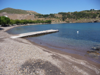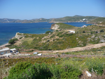 Tout au bout de l'île Geranos. Deux plages, l'une orientée nord très moche et qui sert de cimetière à bateau. L'autre au sud beacoup plus belle, en tout cas vue d'en haut. Les couleurs de l'eau rappellent Balos en Crète, d'autant qu'il y a une langue de sable qui forme une avancée. Ci-dessous à gauche la partie nord, puis la partie sud.