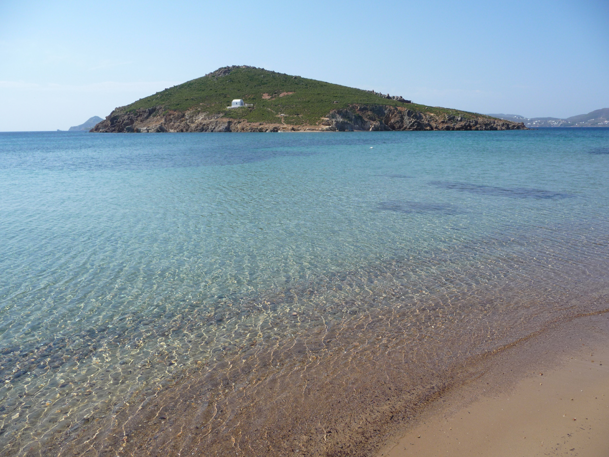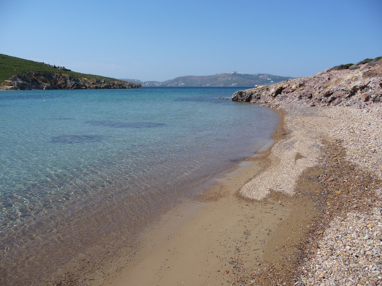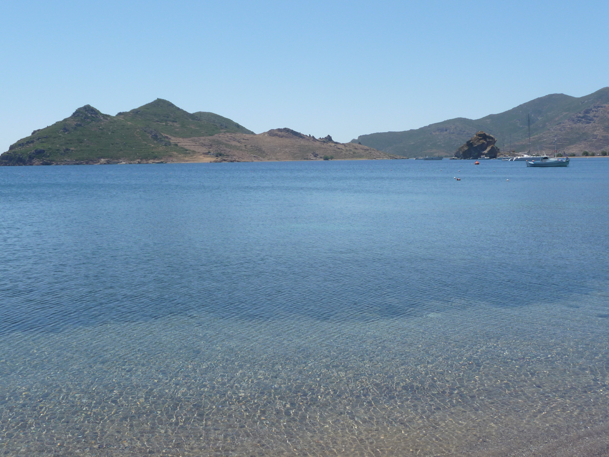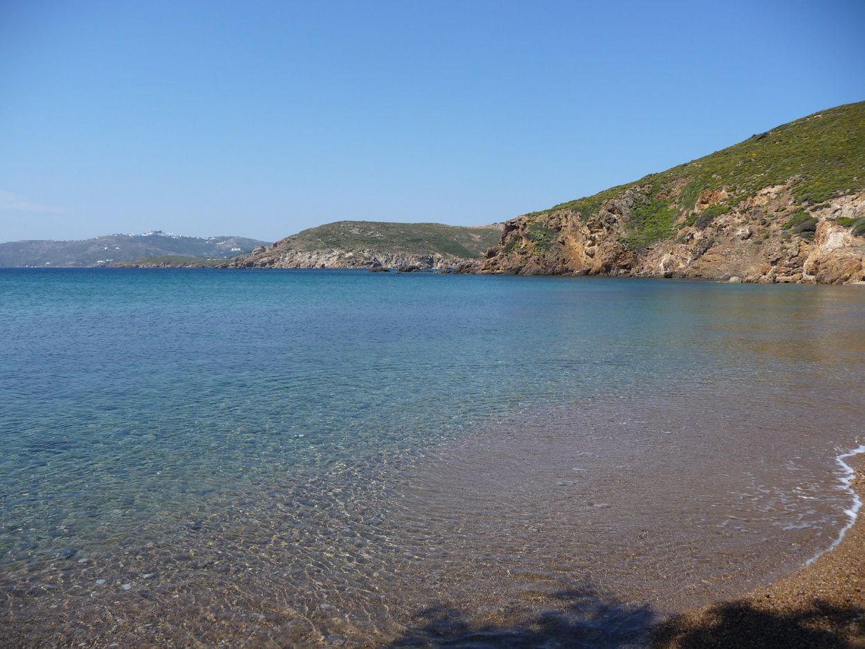 Livadi , que les grecs appellent Livadi Geranou. Sable et graviers, eau très claire et peu profonde avec l'île d'Agios Georgios en face; c'est notre préférée.