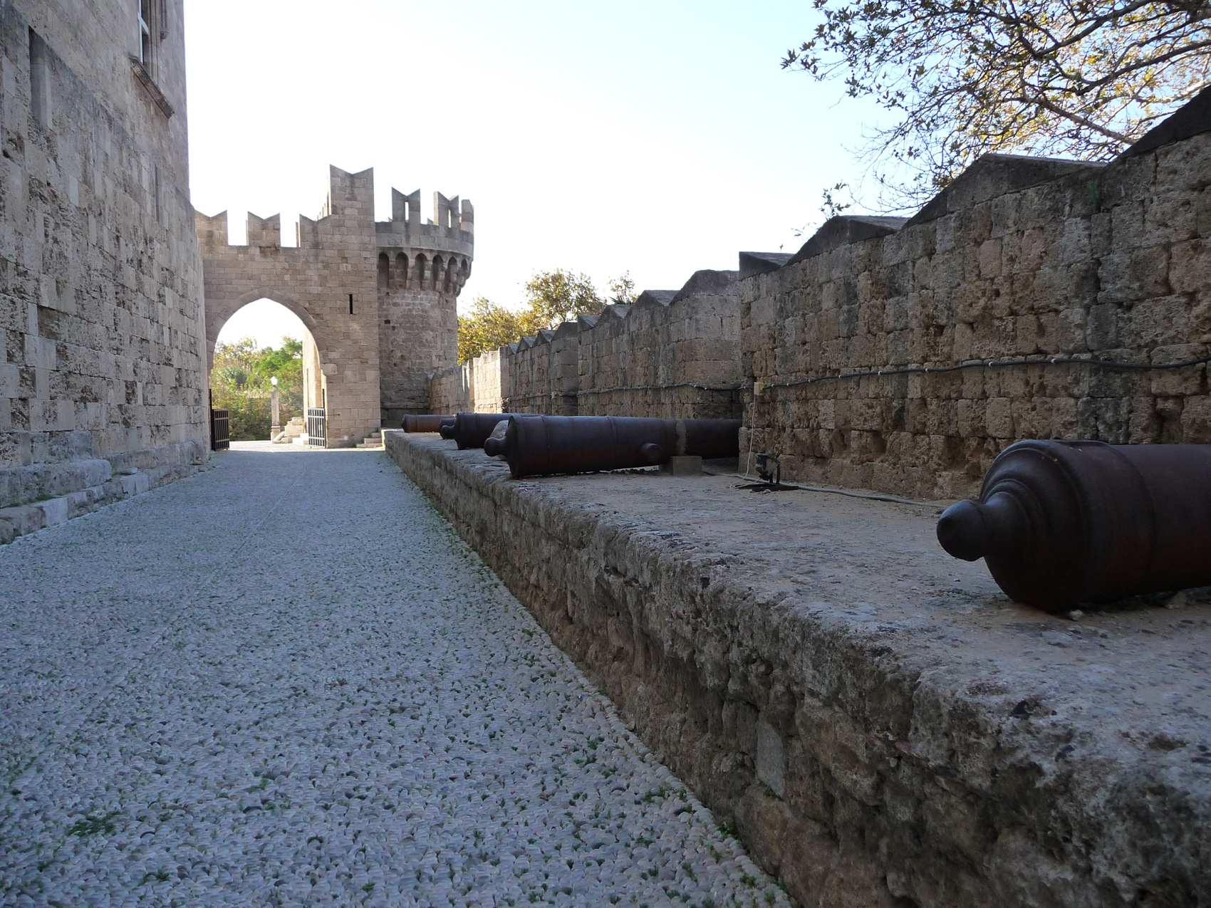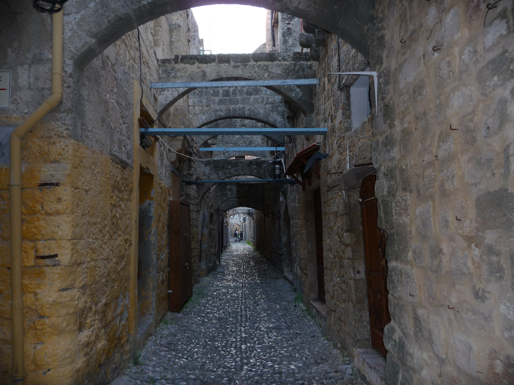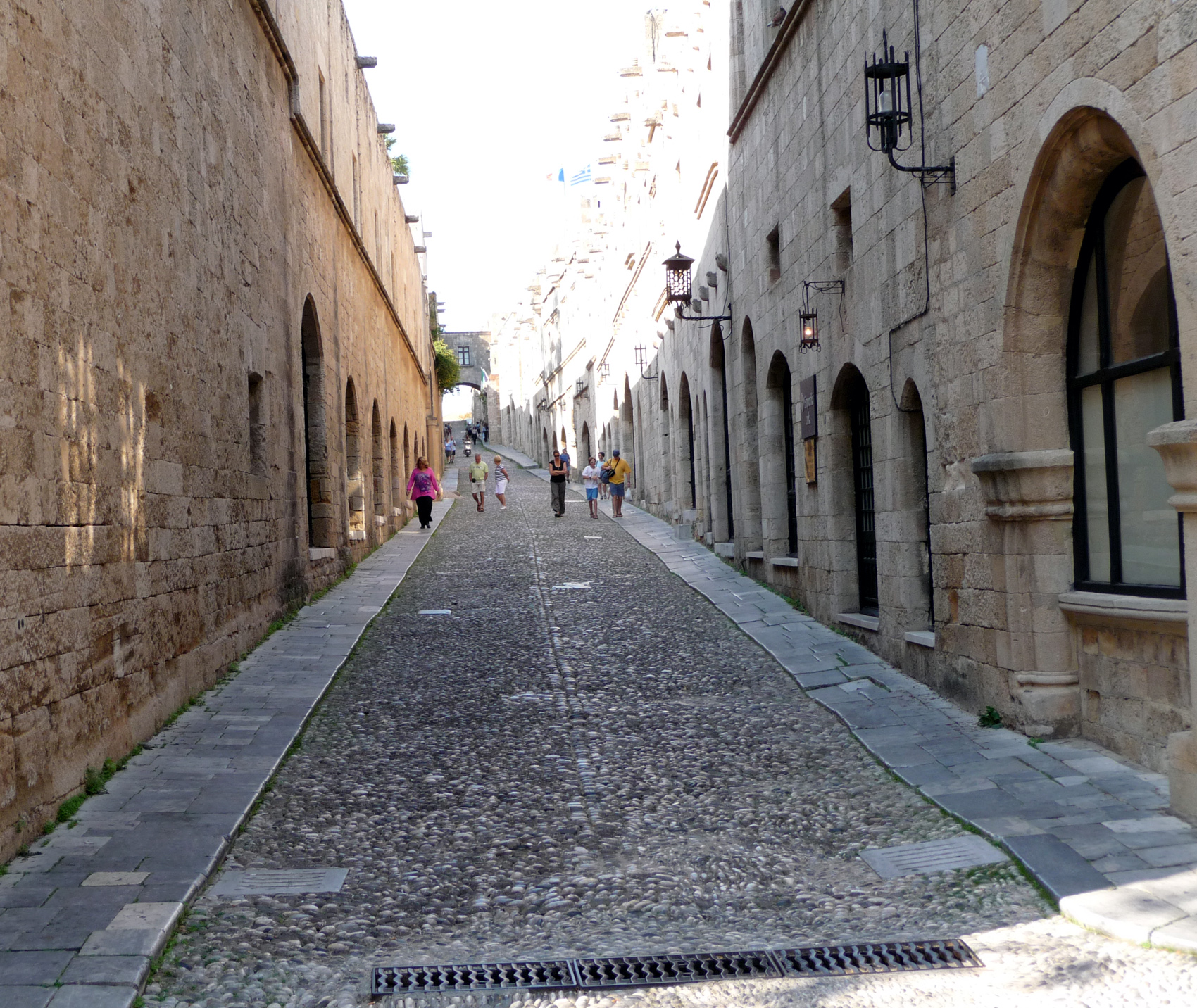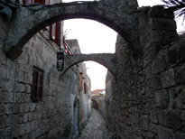 à voir plus particulièrement les statues d'Aphrodite et d'Helios (photos sur la page octobre 2004). Le plus intéressant pour moi est la grande salle où on peut voir les stèles funéraires de quelques uns des grands maîtres, avec leurs armoiries. La rue des chevaliers (ci-dessous) mène du palais à l'hôpital.