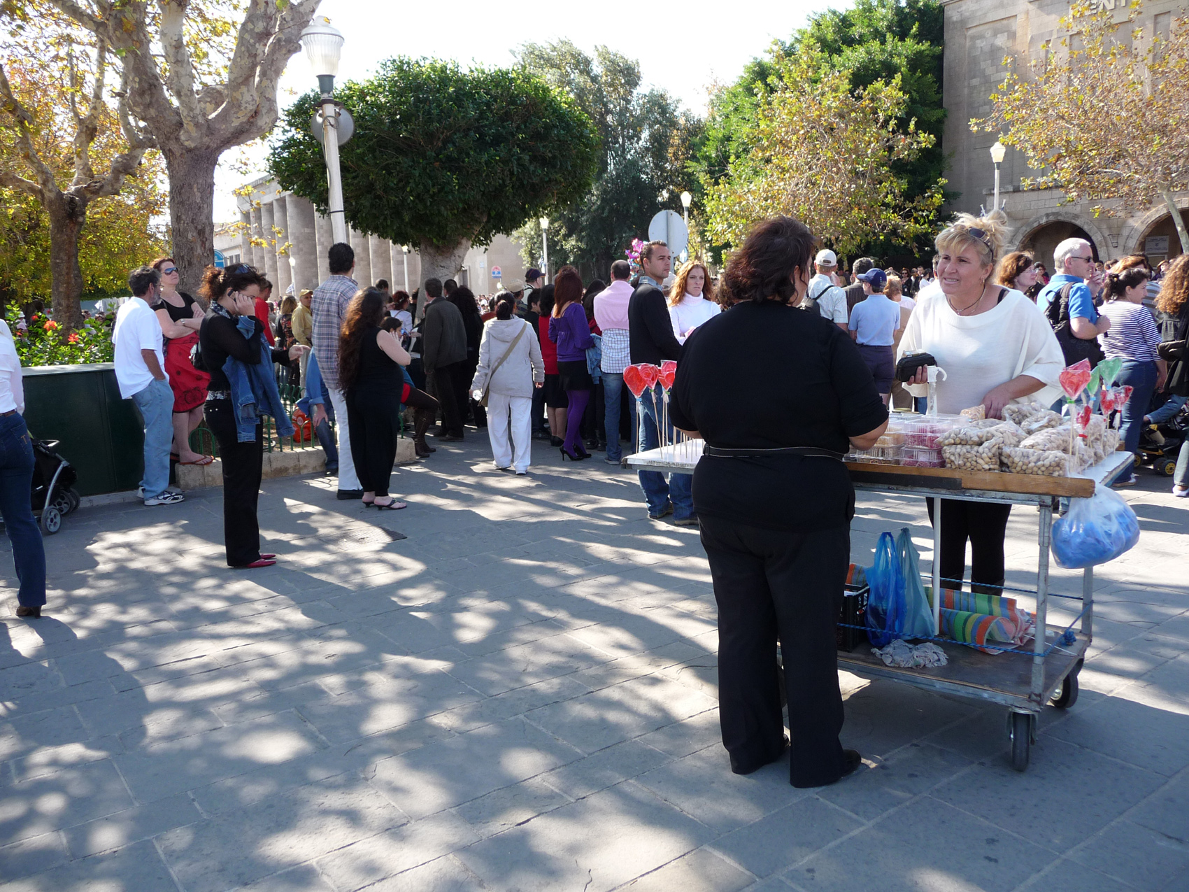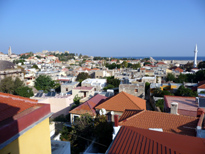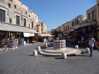 A Rhodes comme dans tous les endroits très touristiques il est amusant de parler un peu grec. Au restaurant Romios une serveuse n'en revient pas et me demande comment j'ai fait. Sur la place Hypocratte quand les rabatteurs des trois ou quatre cafés qui se suivent me raccolent je leur demande qui me fera le meilleur prix. En fait ils sont tous très chers et le jus d'orange est à 5,30 euros ! Au café de la place voisine (evreon martiron) il est même à 6 euros (un grand verre de 50 cl certes mais quand même). Les rabatteurs interpellent les touristes à 20 mètres et s'efforcent de devancer leurs concurrents ; je n'ai jamais vu ailleurs ce comportement développé à ce point , sauf peut être en Crete. Pour moi c'est un mystère, à quoi celà sert-il ? Si on vous interpelle de la sorte, vous allez venir dans ce café ? Moi je préfère aller vers celui que j'ai choisi au départ, voire éviter celui qui m'importune ; mais comme ici ils le font tous ... Je préfère le café qui est à l'extrème droite en les regardant, le serveur/rabatteur est plus sympa (sa femme est suisse), les autres font triste mine et n'apprécient visiblement pas leur travail.