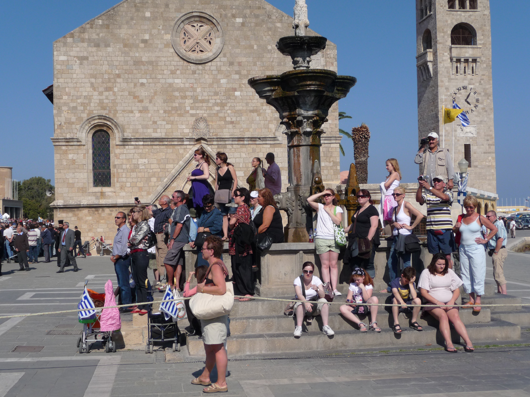 Le 28 octobre est le jour d'une des deux fêtes nationales grecques, celui du ochi day (jour du non) célébrant le 28 octobre 1940. Pour ceux qui veulent avoir un petit aperçu de la vie grecque, y assister donne quelques indications. A Rhodes donc cela se passe de la façon suivante : depuis le matin il y a des centaines d'élèves en tenue identique selon leur classe qui patientent à l'entrée du boulevard du port Mandraki et leurs familles sont sur le trajet du défilé prêtes à les photographier ou applaudir; également un détachement de soldats avec leur musique; comme on est à Rhodes il y a un navire militaire dans le port qui partira le soir même. On commence par une messe dans l'église située sur le port réunissant tous les prêtres (évidemment), les invités de marque et personnalités et tous les officiers en grand uniforme. Ensuite on sort de l'église en cortège et les prêtres prononcent quelques paroles devant tout ce beau monde, peut être une bénédiction. Vous imaginez le défilé du 14 juillet commençant par une messe et une bénédiction ? En Grèce les festivités mélangent le laïque et le religieux d'une façon étonnante pour nous : ainsi le jour de la fête nationale les religieux participent activement et à Pâques les militaires suivent la procession du vendredi saint. Tout est prêt ensuite pour le défilé, qui réunit tout ce qui peut défiler : pompiers, groupes folkloriques en costume, secouristes, scouts et bien entendu toutes les écoles en commençant par les plus jeunes, drapeau en tête porté par les plus méritants. J'ai noté également que les jeunes handicapés qui défilent eux aussi sont particulièrement applaudis par la foule. Pour finir c'est l'armée qui défile à son tour, très appréciée par la foule. La musique joue les mêmes marches entendues 4 ans plus tôt à Lesbos. A la fin du défilé tout le monde va manger en famille. Toute la matinée le port de Mandraki est interdit à la circulation et le soir vers 17h une dernière prise d'armes devant un batiment officiel cloturera la journée. Sur le port près des moulins on tire le canon !
