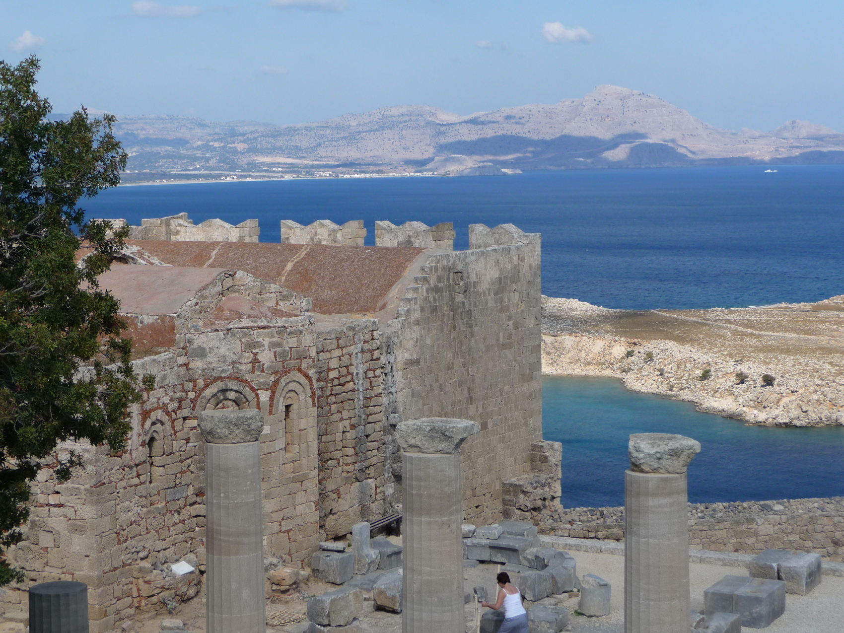 Lindos a été notre seule excursion en dehors de la ville. Elle en vaut vraiment la peine; toujours du monde certes (laissez votre voiture en haut de la route et descendez à pied). Quelques unes des ruelles du village sont dévolues au commerce (restaurant, bar, souvenirs) mais d'autres sont encore vierges. La montée vers la forteresse est accompagnée par les marchands de dentelle ou autres babioles. Parmi ces marchands certains ont un âge très avancé.