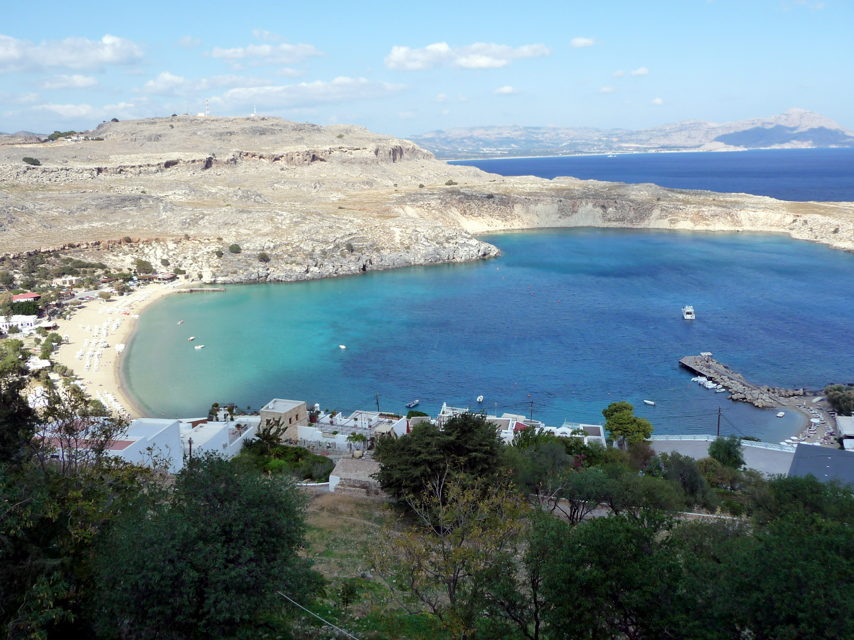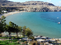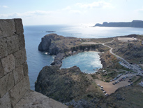 De là haut on a une vue magnifique sur la plage de Lindos (à gauche), la mer et la petite plage de St Paul presque fermée (à droite)