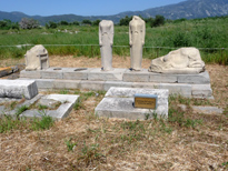 En allant vers l'aéroport on arrive à l'Héraion, autre site classé par l'Unesco. La principale sculpture plus ou moins préservée est en fait une copie (photo gauche), l'original est au musée deVathy. Un site assez vaste et assez ruiné. Le vestige le plus apparent est une colonne du temple d'Héra, (photo droite) assez haute et qui pourtant ne représente que la moitié de la hauteur initiale ! Le temple faisait plus de 100 m de long et était un des plus immenses jamais construits. En avril certaines ruines basses sont ... cachées par la végétation, les hautes herbes et les fleurs sont partout et la débrousailleuse n'est passé qu'en quelques endroits, il est alors assez difficile de se positionner sur le plan malgré les repères présents (en anglais) sur le site. C'est ici qu'on a trouvé en 1980 le colossal Kouros exposé au musée de Vathy.