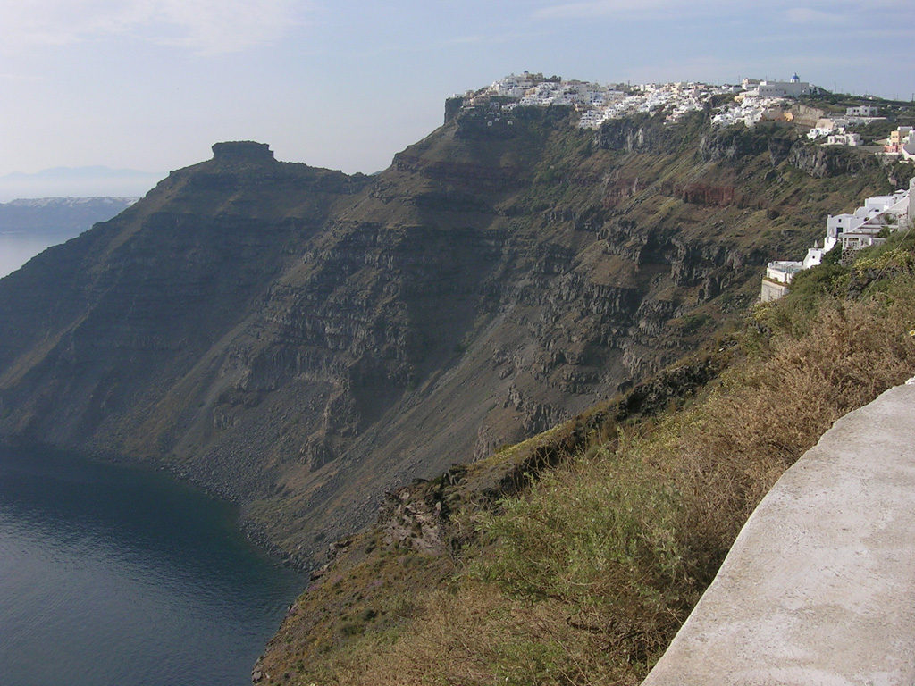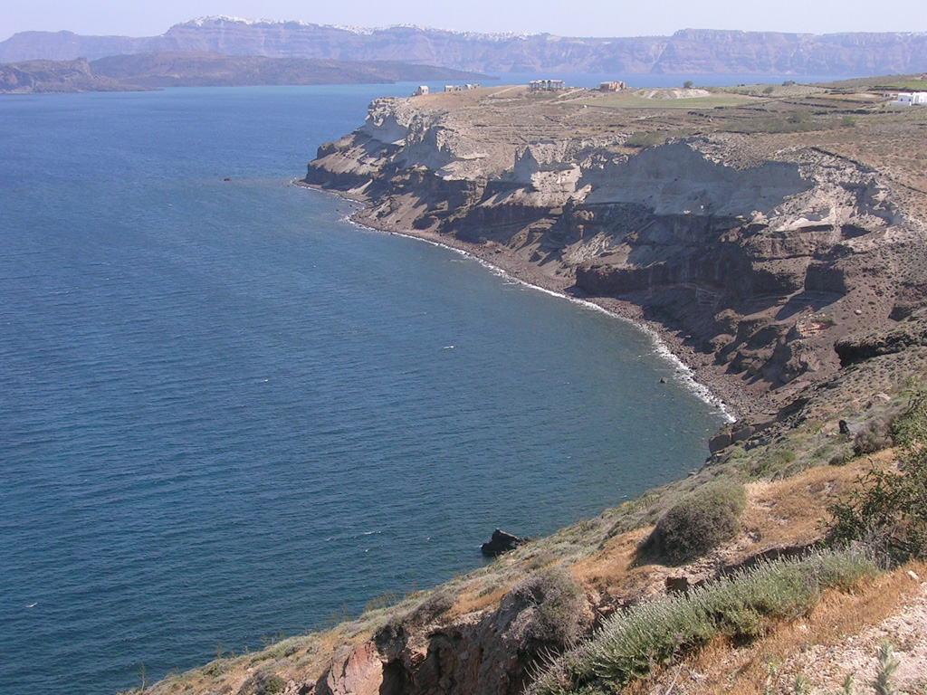 En premier lieu et s'il n' y avait qu'une seule chose à voir : la falaise dominant la caldeira et les incroyables paysages qu'on découvre des villages de Oia, Fira ou Imerovigli. La mer d'un bleu outremer profond et magnifique, les maisons blanches ou de couleur pastel et les églises aux dômes bleu sont certes très connues (les cartes postales de Grece les plus vendues ?) mais on ne peut se lasser de la vue.