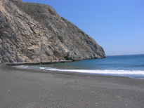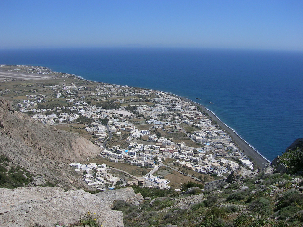 La plage de PERISSA se prolonge par PERIVOLOS et AGIOS GEORGIOS sur des kms et des kms. Elle s'arrête au pied de la colline de l'ancienne THIRA par quelques restaurants agréables (photo du centre ci-dessous)) . Ci-dessous vue des plages de KAMARI (à gauche) et de PERISSA (à droite) depuis l'ancienne THIRA