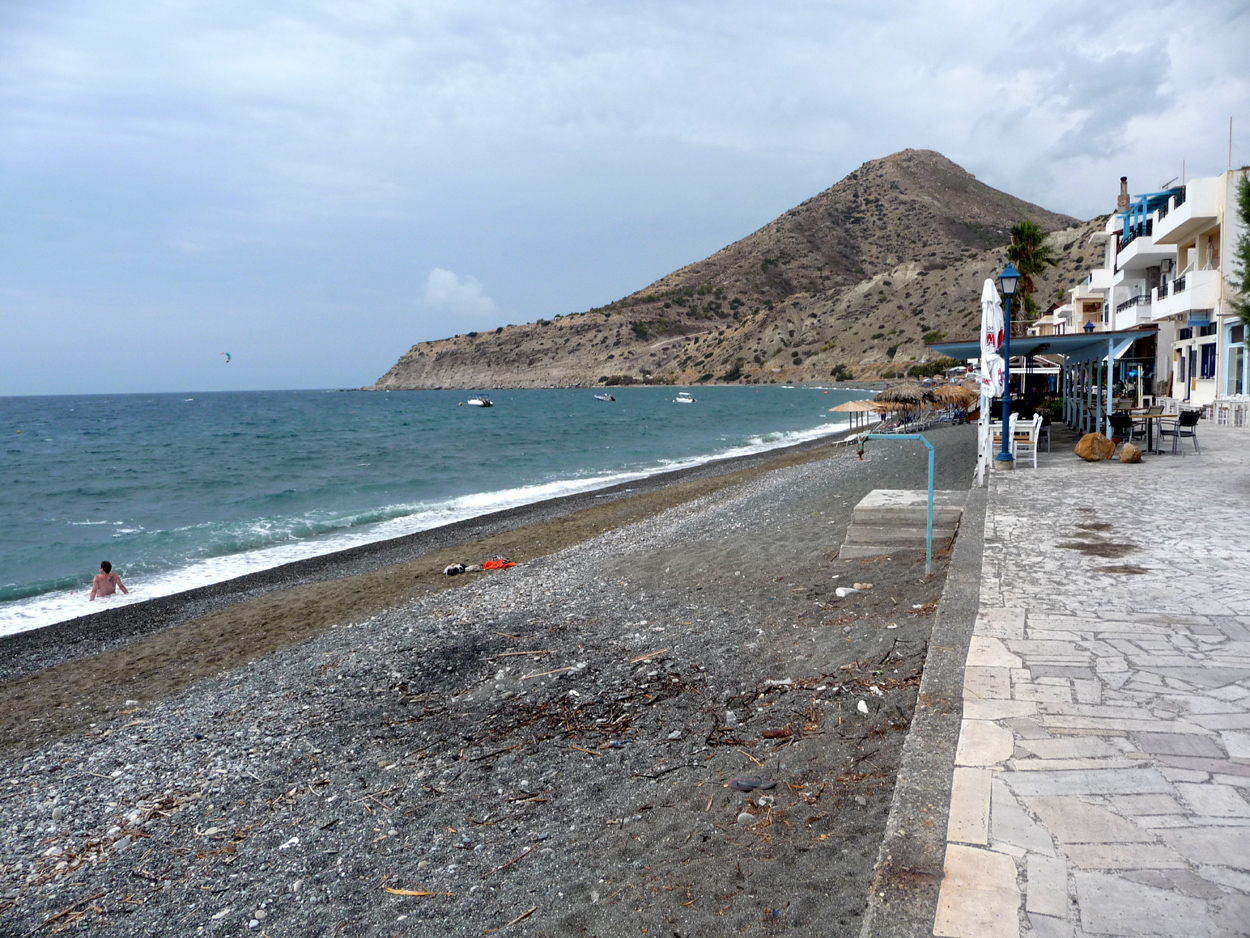 Lundi 21 : départ pour la plus longue étape de Sitia à Zaros. Nous prenons la route de Ierapetra où on ne s'arrêtera pas. Tout autour de Ierapetra beaucoup de constructions et à l'Est des hôtels all-inclusive, un coin qu'on n'apprécie pas beaucoup, mais sur la côte sud en allant vers l'est on trouve de très jolis coins (voir séjour en juillet 2010). Puis on part le long de la côte sud et on choisit de faire un arrêt à Myrtos, petite ville côtière encore inconnue (pour nous). Une petite ville donc où on croise quand même des touristes, mais le village est peu construit, les rues sont étroites; beaucoup de cafés et bars le long du front de mer, surplombant la plage. Nous choisissons le café "moments" pour prendre un jus d'orange moins cher que dans les grandes villes : 2,50 euros. Moment agréable, peu de monde, le patron discute avec ses potes, un peu de vagues mais ... comme on peut le deviner sur la photo ci-dessous beaucoup de nuages vers l'ouest, pas bon ça d'autant que la veille à la TV on a vu une miss météo déjantée (sur la chaîne ALTER) danser et chanter pour montrer de la pluie sur la Crète. Comme ça se gâte et que les nuages deviennent de plus en plus noirs, nous repartons.