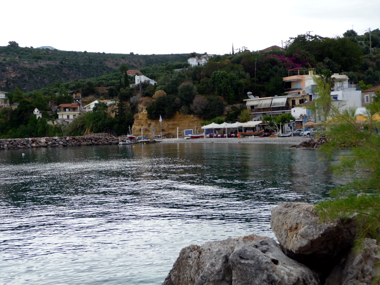 Départ de Pylos pour Aréopolis, afin de re-visiter le Magne. La route qui suit la mer entre Kalamata et Arépopolis est superbe. Sur les recommandations du GDR nous avions réservé au "Ktima Karageorgou". Très bonne pioche : endroit superbe, hôtes accueillants, un hôtel à recommander. La patronne nous accueille en nous donnant des indications sur le pays, et avec une carte très détaillée. Un truc curieux en ce dimanche soir : pratiquement tous les restos sont fermés, on ne trouve qu'un petit troquet sur la place principale où on arrive quand même à manger. Le lendemain ce sera bien meilleur car il y aura d'autres endroits ouverts. Heureusement on avait très bien mangé au déjeuner dans le tout petit village de Kitries, quasiment les pieds dans l'eau. Et malheureusement encore une averse pendant ce déjeuner.