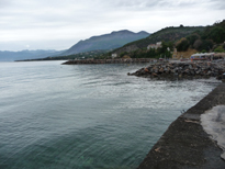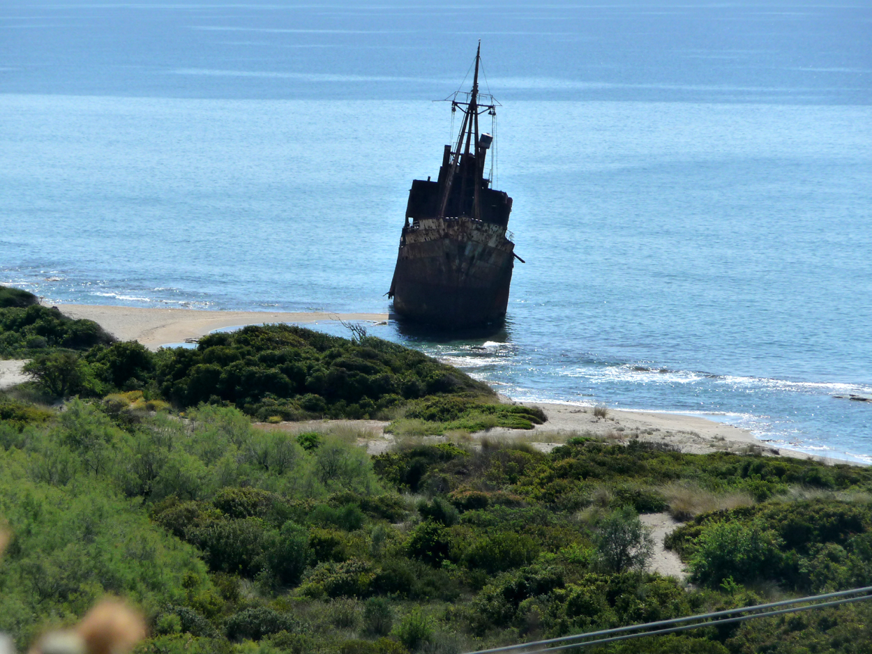 Départ vers Monemvassia en passant par Gythion. Un peu au nord de Gythion une curiosité, un vieux bateau rouillé échoué sur la rive, pas très beau comme ornement.