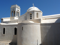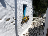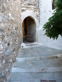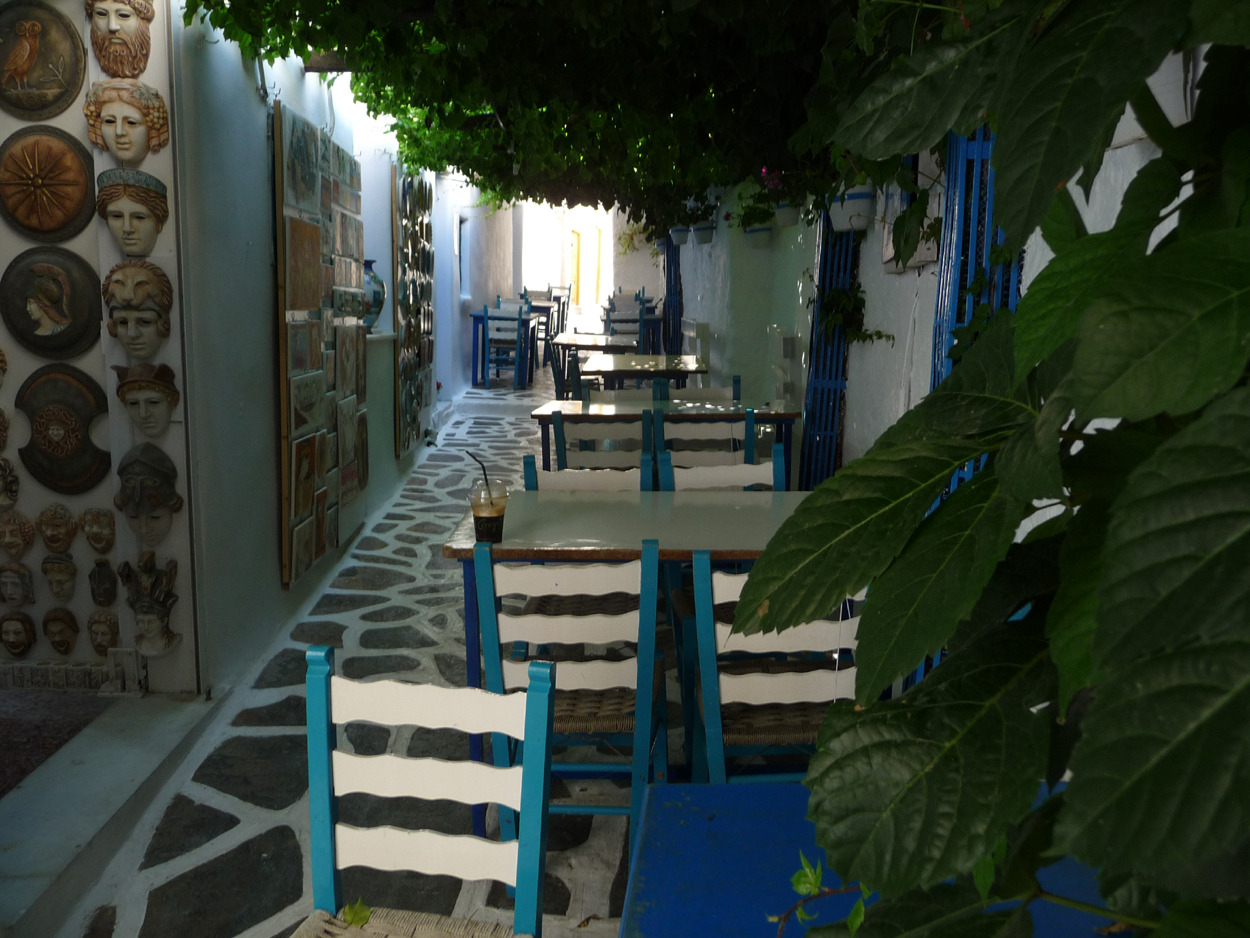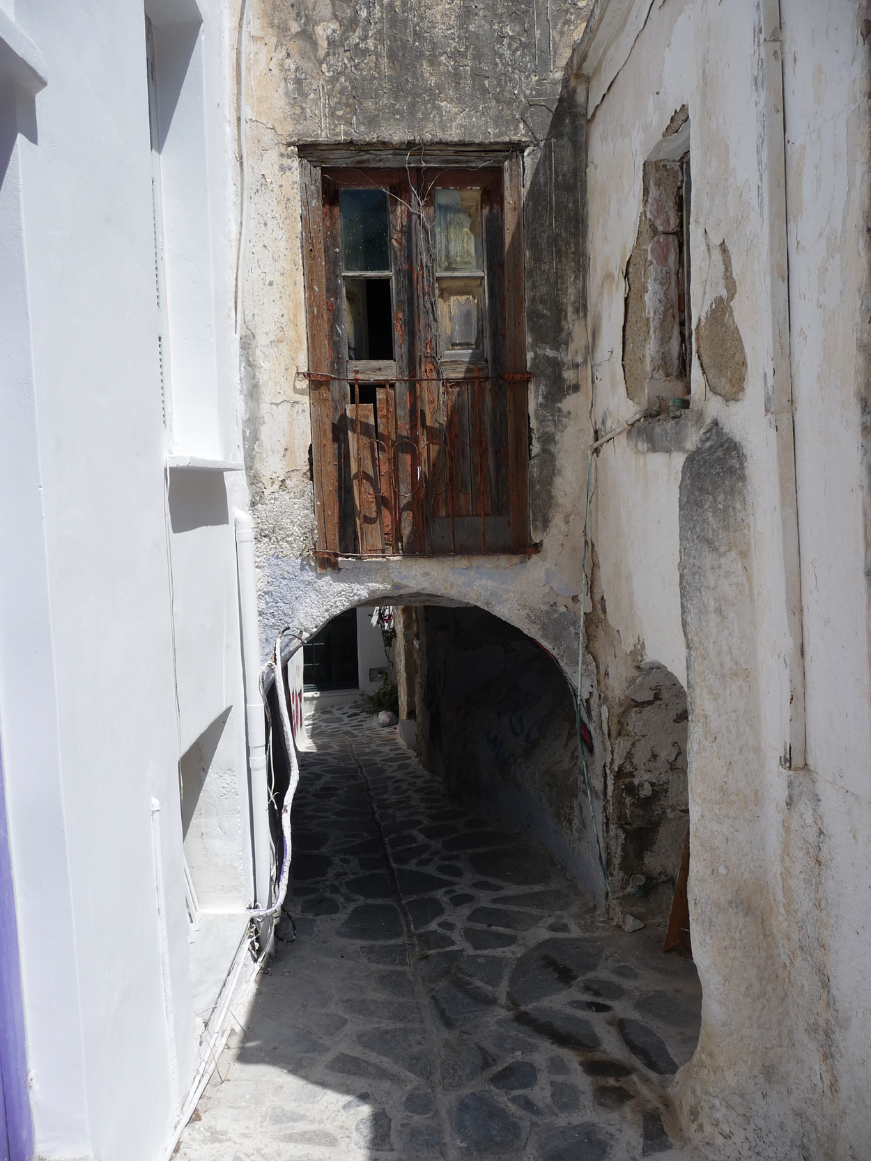 Le quartier du Kastro est un grand atout de Chora; en effet ses ruelles sont souvent à l'ombre et on peut s'y promener même quand il fait grand soleil. Beaucoup de boutiques surtout en bas. Il peut y avoir du monde, mais nous avons réussi à toujours nous trouver dans des ruelles plus calmes. Tout en haut la cathédrale catholique (13ème siècle) et juste derrière une petite église orthodoxe où un vieux monsieur invite tous les passants à entrer pour la visiter (visite très courte évidemment).