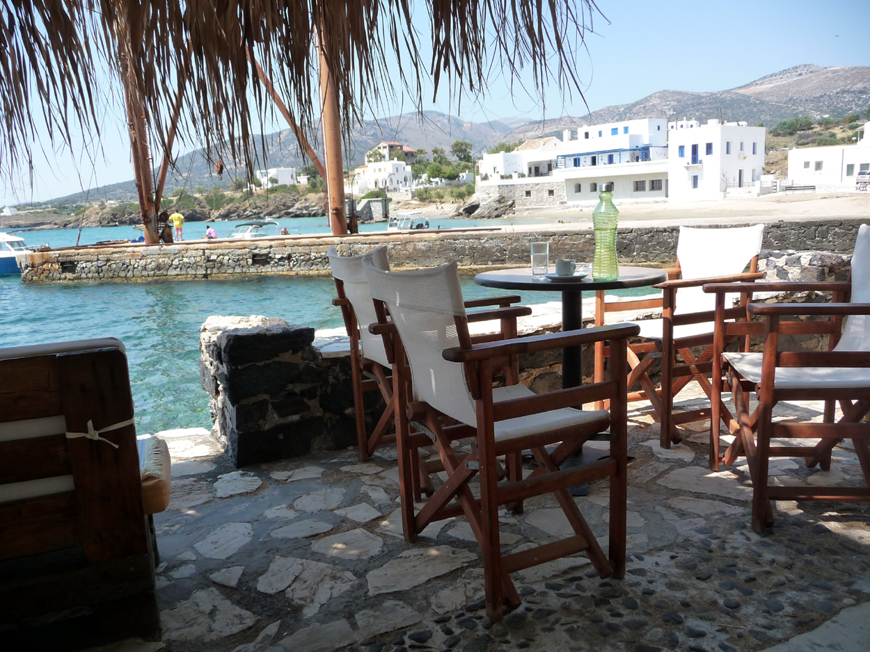 Après Apiranthos la route pour aller jusqu'à Moutsouna est en très bon état et on passe par des paysages désertiques, du roc et de la caillasse partout, on a l'impression d'aller au bout du monde. Et le bout du monde c'est Moutsouna où on a fièrement gardé les vestiges de l'exploitation des mines d'émeri (quai d'embarquement et funiculaire pour les bennes). Ce dimanche un peu plus de monde (?) à la terrasse du café où nous goûterons un jus d'orange bien mérité à 3 euros Quelques familles grecques se baladent et des enfants jouent sur la toute petit plage. On est très très loin de l'agitation de la côte ouest, si vous cherchez le calme il faut venir de ce côté.