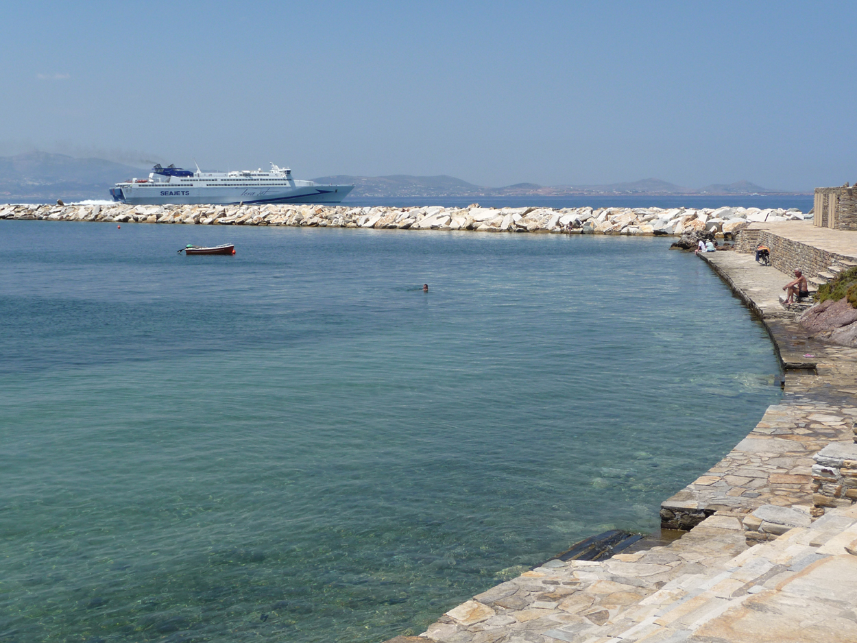 Le trajet de Naxos à Amorgos se fera sur le Hellenic seayways high speed 4, énorme catamaran rapide, très confortable avec vent de force 4. Les billets ont ét achetés chez "passenger travel" petite boutique entre Zas travel et Naxos tours, employée très aimable. Pour ceux qui comme moi auraient le mal de mer, je recommande de prendre un gros bateau comme ce high speed plutôt qu'un seajet, beaucoup plus sensible à l'état de la mer. En plus dans le seajet on est assez serré, peu de place pour les jambes et interdiction de sortir sur le pont .