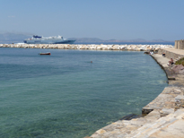 Beaucoup de restaurants et cafés le long du port de Chora jusqu'à l'arche de Palatia. Un joli port avec un petit quai pour le Skopelitis et un grand pour les autres bateaux; lorsqu'ils sont deux à être à quai simultanément (c'est le cas avec le gros ferry de Hellenic Seayways et le petit catamaran de seajet qu'on voit ci-dessous) celui-ci doit faire une manoeuvre très précise pour se ranger à côté du monstre. Le long du port je recommande la boutique MILKATO qui vend ... des glaces. On a en goûté plusieurs et elles sont toutes bonnes, de plus une serveuse parle français et se fait un plaisir d'essayer de nous parler. Parmi toutes les boutiques de Chora je signale la boutique de tee shirts "palatia shop", à côté du marchand de journaux, parce que le patron est très sympa.