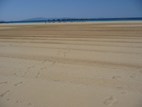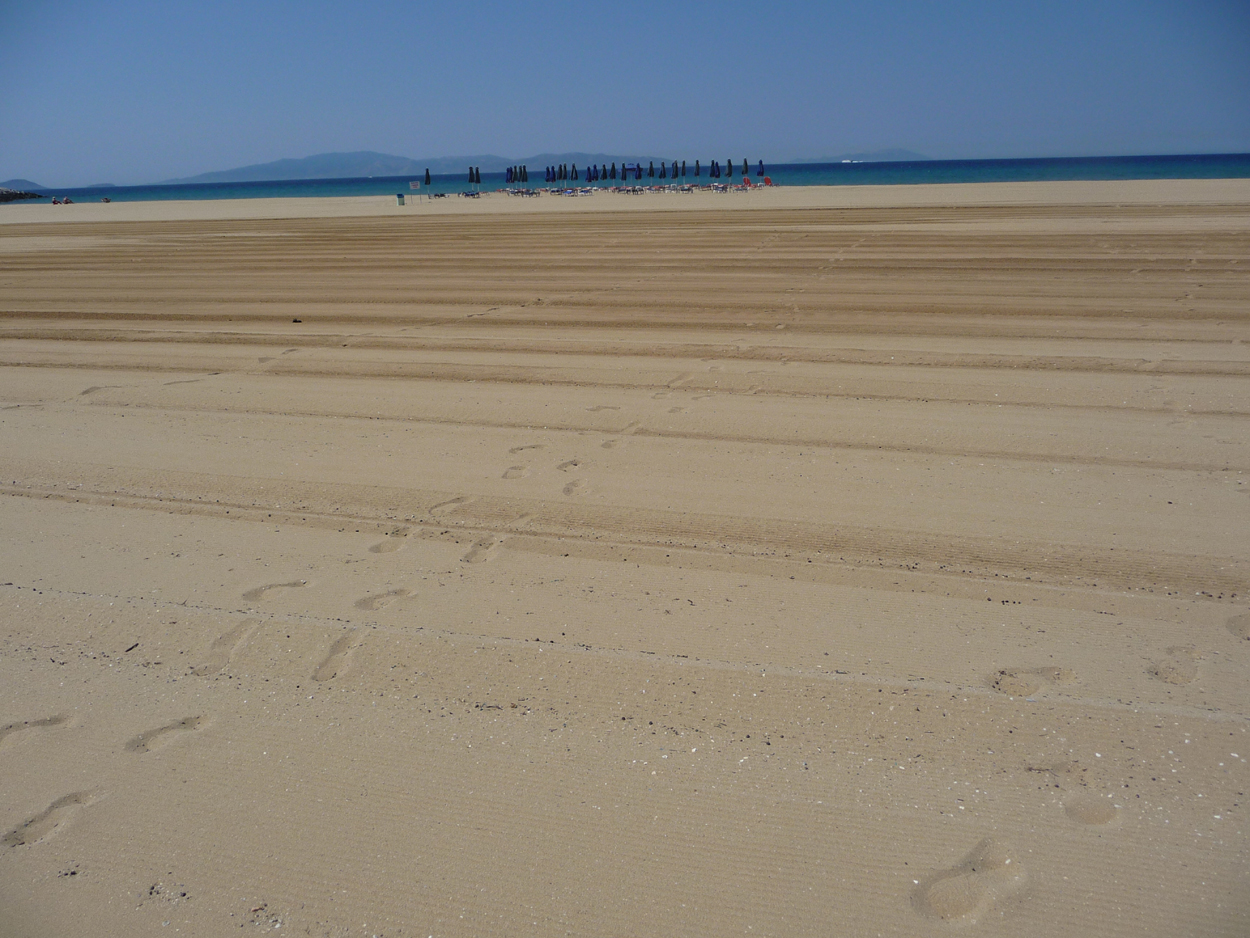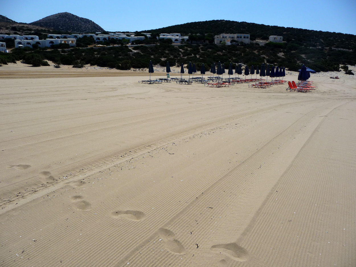 Encore plus au sud une plage très curieuse, celle de Pyrgaki. A mon avis on a du aplanir une dune pour l'agrandir car comment imaginer une aussi belle étendue de sable aussi plane, aussi bien étalée ? On voit en tout cas les traces des engins qui ont nettoyé la plage et on peut observer nos propres pas. Ce matin quasiment personne, même si des parasols sont prêts, on a eu de la place pour la baignade. Pour y aller on suit une piste en très bon état et sans danger pour la voiture. Le fond descend très lentement comme à St Georges.