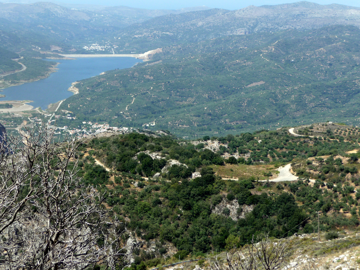 Ensuite direction du plateau de Lassithi. Nous suivons les conseils du GDR en prenant la route recommandée. C'est une très bonne idée car non seulement le paysage est agréable mais la route est neuve et large. Une curiosité géologique ce plateau (il parait que ça s'appelle un polje) : situé à 800m d'altitude, entouré de montagnes et garni des célèbres éoliennes qui servaient à l'irrigation, maintenant en ruines pour celles qui restent. On peut facilement faire le tour du plateau en voiture. Belle vue à l'entrée du plateau, avec de vieux moulins en sentinelle; un grand parking pour admirer et photographier le paysage mais attention à l'énorme attrape touristes qui s'y trouve (café, restaurant et je ne sais quelle attraction bidon).