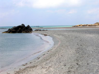 Elafonissi est toute proche et là bonne surprise : la plage ne s'est pratiquement pas développée depuis 4 ans : pas de cubes de béton, de constructions, la plage et ses abords sont quasiment intactes. En short je peux gagner l'ilôt en face, vers lequel quelques touristes grecs ou étrangers se dirigent pour pique niquer (photo de droite). Ici pas de pétrole heureusement, l'eau est claire et le sable encore rose au moins par endroit (photo du centre) ; malheureusement il y a un vent fort qui nous refroidit un peu mais cette plage est toujours la plus belle de celles que j'ai vues.
