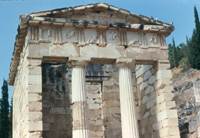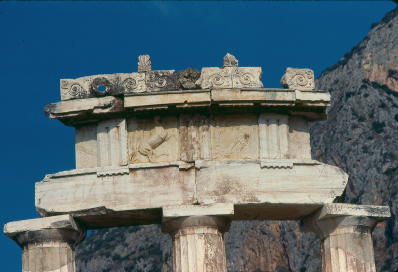 Un peu plus bas en descendant sur la droite (allez y à pied), le sanctuaire d'athéna et sa fameuse tholos. C'est là que tout le monde vient se faire photographier. Une partie du site est maintenant inacessible (gymnase ...) alors qu'on pouvait y acccéder autrefois. Si vous boulez voir le détail de la frise de la tholos, cliquez ICI