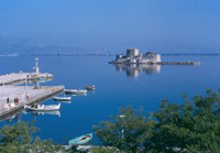 La ville de NAUPLIE est très agréable, et mérite bien qu'on s'y arrête: les terrasses le long de la mer avec un joli coucher de soleil, l'ilôt Bourtzi et son vieux fort vénitien, la forteresse palamède (en voiture c'est moins fatiguant), le musée du komboloi., des cafés-glaciers accueillants, et pour vous mesdemoiselles des tas de bijouteries...