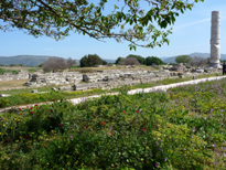 En allant vers l'aéroport on arrive à l'Héraion, autre site classé par l'Unesco. La principale sculpture plus ou moins préservée est en fait une copie (photo gauche), l'original est au musée deVathy. Un site assez vaste et assez ruiné. Le vestige le plus apparent est une colonne du temple d'Héra, (photo droite) assez haute et qui pourtant ne représente que la moitié de la hauteur initiale ! Le temple faisait plus de 100 m de long et était un des plus immenses jamais construits. En avril certaines ruines basses sont ... cachées par la végétation, les hautes herbes et les fleurs sont partout et la débrousailleuse n'est passé qu'en quelques endroits, il est alors assez difficile de se positionner sur le plan malgré les repères présents (en anglais) sur le site. C'est ici qu'on a trouvé en 1980 le colossal Kouros exposé au musée de Vathy.