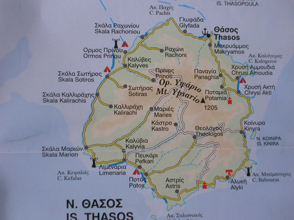 Thassos est vraiment une île très très agréable. Peu éloignée du continent elle offre quantité de plages plus ou moins grandes, mais aussi la possibilté de loger "au frais" sans air conditionné en particulier dans le village de Panagia.